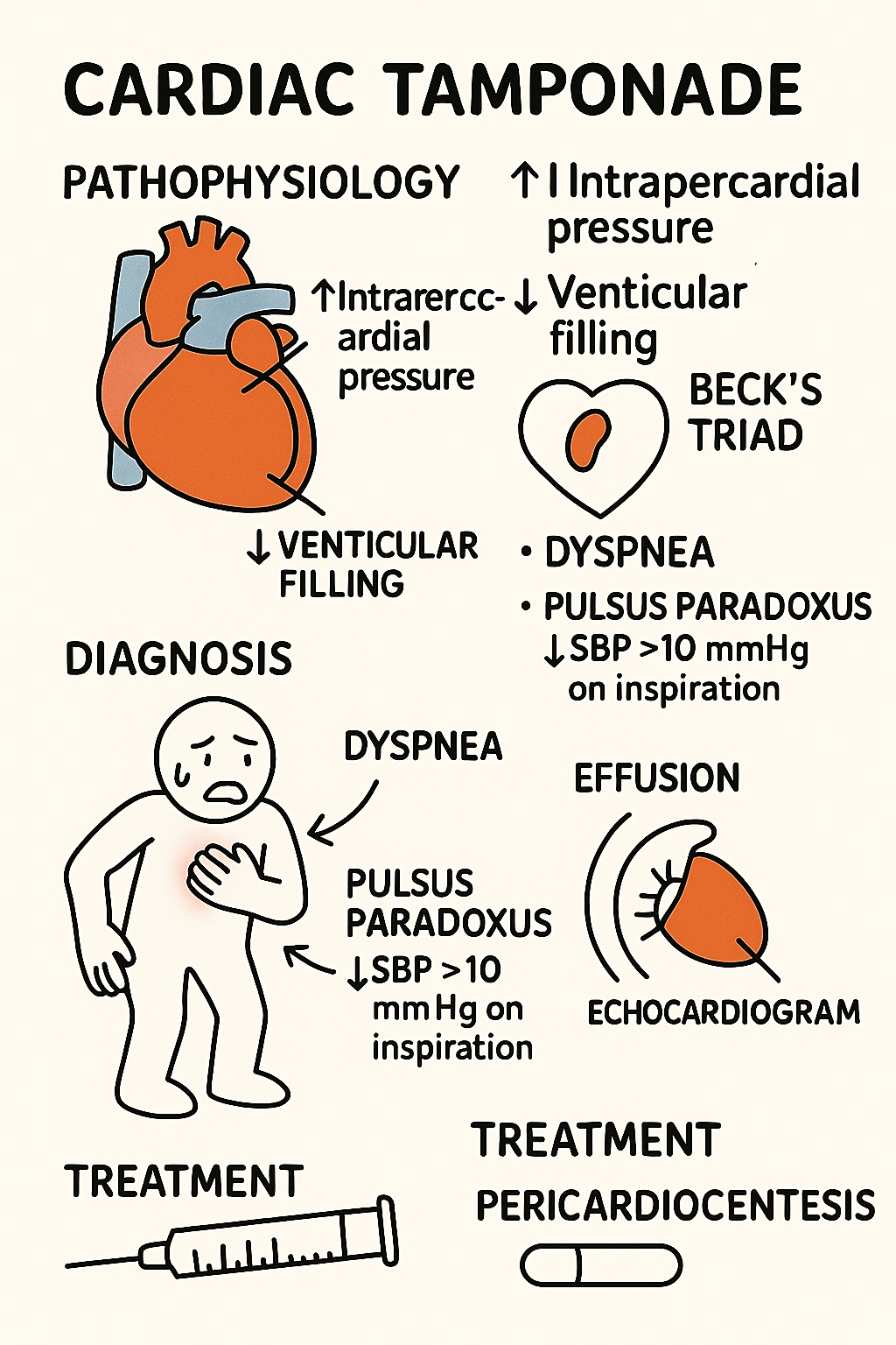 Definition: Life-threatening accumulation of fluid in the pericardial sac causing ↑ intrapericardial pressure → ↓ ventricular filling → ↓ cardiac output.