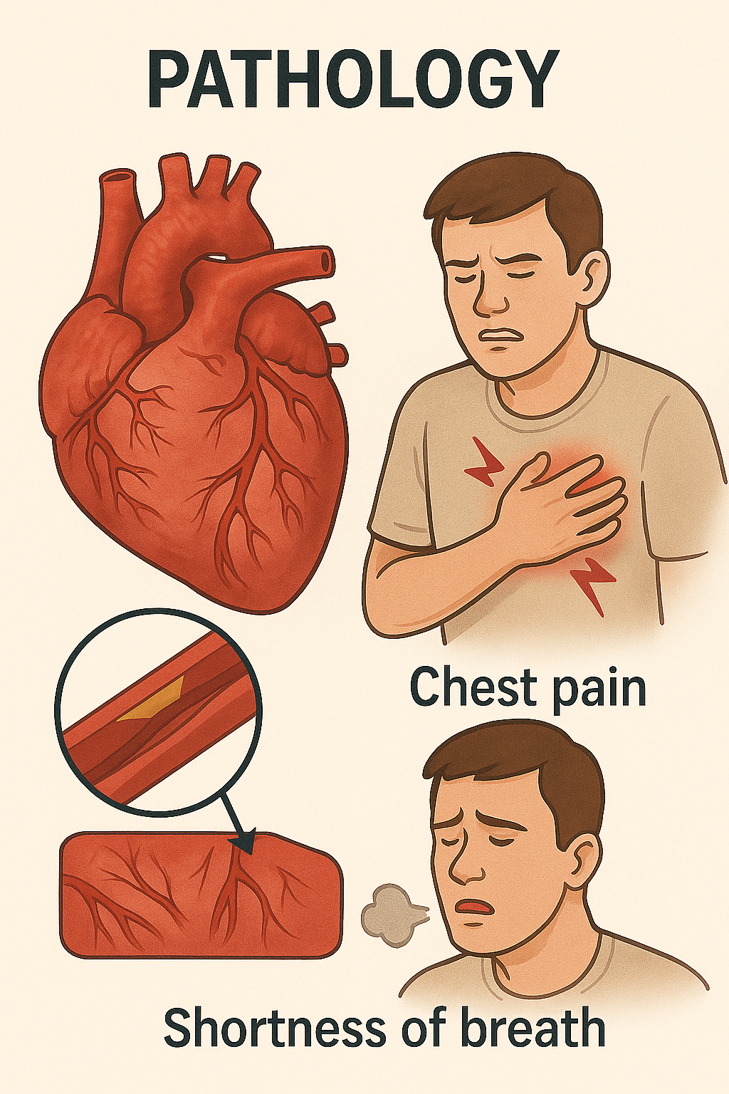 Caused by atherosclerosis—buildup of lipid plaques in coronary arteries → narrowing of the vessel lumen → reduced blood flow to myocardium.